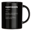 Microwavable and certified food-grade black ceramic mug packed in a box with a side window.